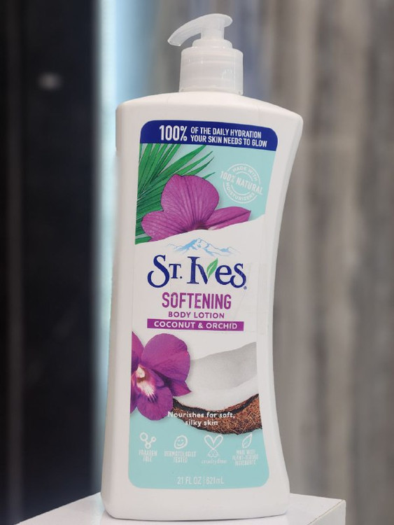 لوسیون بدن نرم کننده Softening از برند محبوب سینت ایوز St.Ives با عصاره و رایحه ی شیر نارگیل و گل ارکیده به شکل فوق العاده ای پوست شما را مرطوب خواهد کرد. این لوسیون یک مرطوب کننده صد در صد طبیعی بوده که اثری از چربی روی بدن باقی نمی گذارد.عصاره طبیعی ارکیده موجود در این لوسیون، پس از استفاده به آرامی جذب پوست می شود و عطر خوب این گل خوشبو را روی پوست بدن بر جای میگذارد و به شما حس زیبای تازگی و طراوت را هدیه کند. در ساخت این محصول از مرطوب کنندههای صد در صد گیاهی چون گلیسیرین گیاهی، روغن سویا، عصاره نارگیل و ارکیده استفاده شده است و هیچ گونه ماده حیوانی در آن به کار نرفته است و مورد تایید متخصصان پوست می باشدتمام بادی لوشن های سینت ایوز برای نرم کردن پوست، نگه داشتن رطوبت طبیعی و مراقبت از پوست در برابر آب و هوای خشک، سرما و گرمای شدید ساخته شده اند و انعطاف پذیری و قابلیت ارتجاعی پوست را بیشتر می کنند.